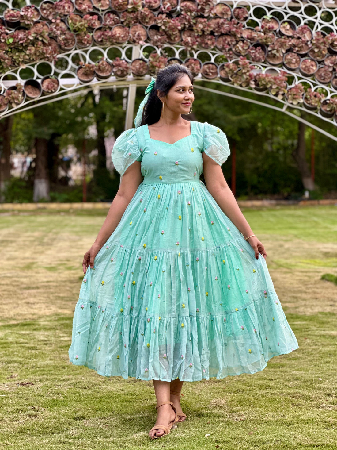 Step into effortless elegance with this premium mul chanderi tiered frock, designed with a flared...