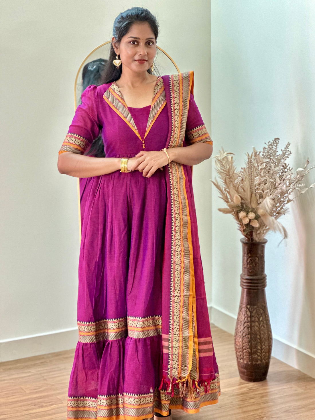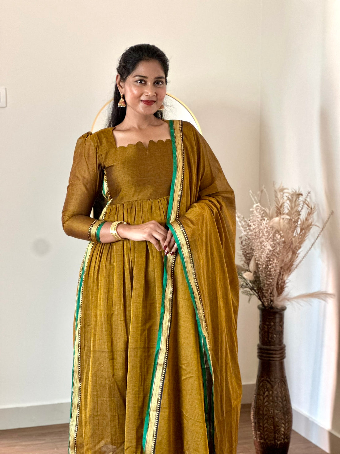 Step into effortless elegance with this handloom cotton gathered Anarkali, designed to bring together comfort...