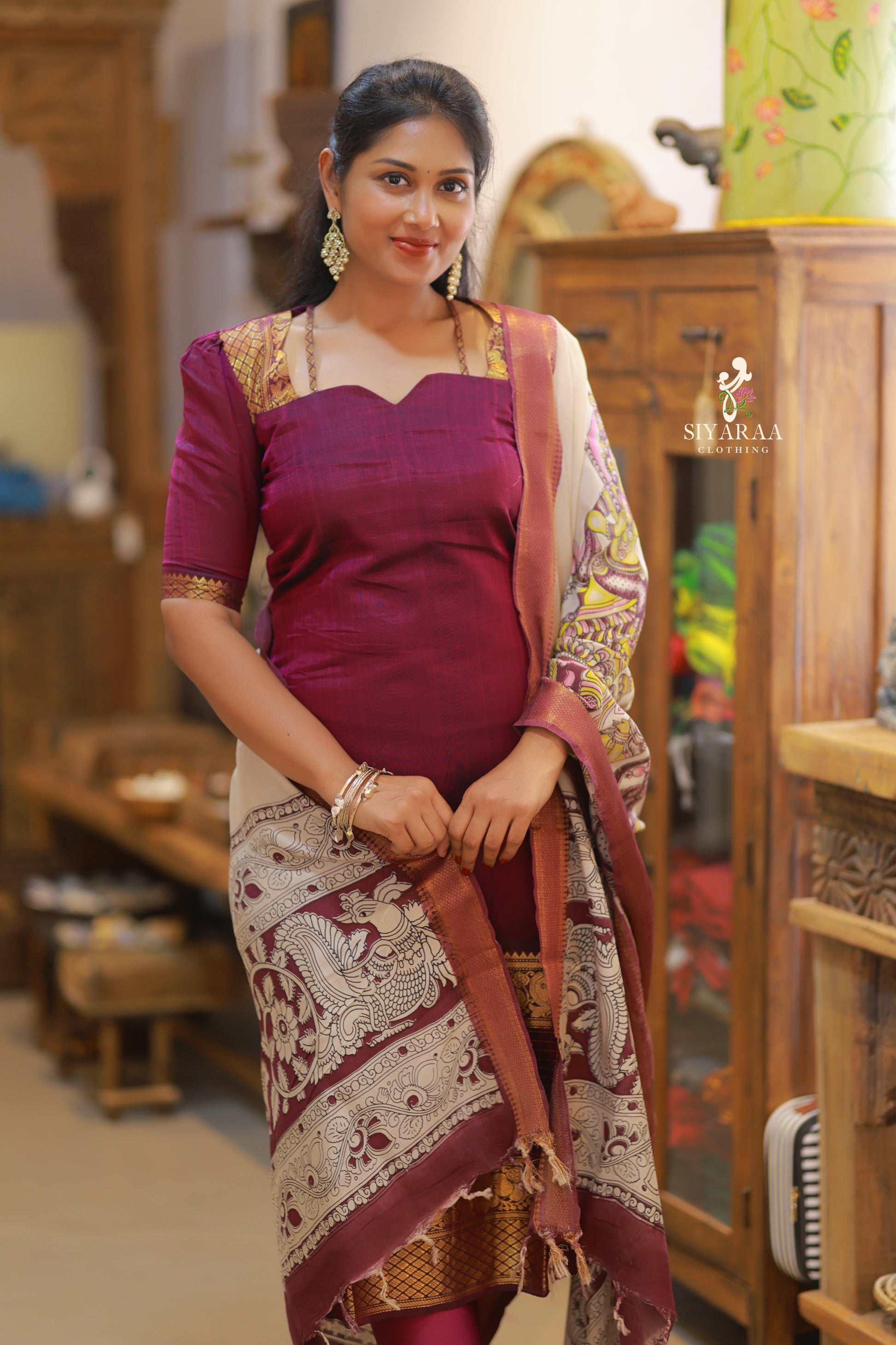 SIYA082 Wine | Iraaya Mangalagiri Silk Top with Kalamkari Dupatta (2-Piece)